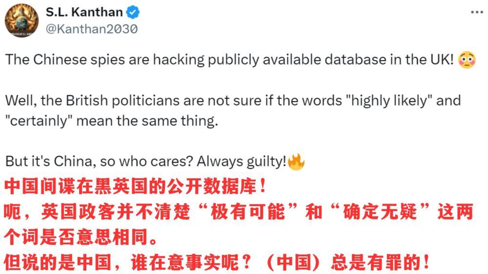 再看英国。记者首先对相关政客的表述展开了一番文义溯源。副首相先是扬言他“证实”该国遭受中国网络攻击,随后措辞转为“几乎可以确定”,官方公布的新闻稿中也使用了“极度可能”一类的字眼,这让记者不禁想到,《牛津英语词典》是不是有必要考虑对“证实”一词的释义作出更新?