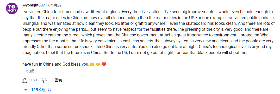 3)还有来过中国上海的美国人说,他来过四次中国,每次都能看到中国的进步和变化,他在上海的公园看到中国非常干净,没有各种垃圾和涂鸦,而且连滑板场看起来都很干净,城市里面很多电动汽车在行驶,整个城市非常方便,已经是无现金社会,同时中国很安全,在美国他晚上不太敢出门,因为怕黑人持枪枪击他.....