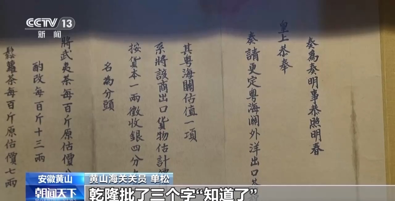黄山海关关员 单松:这是一份乾隆年间的奏折,它的主要内容就是提高出口茶叶的价格,距今已经260多年,乾隆批了三个字“知道了”,特别有趣。