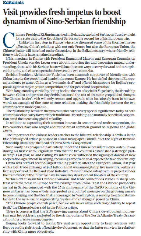 原文标题:Visit provides fresh impetus to boost dynamism of Sino-Serbian friendship