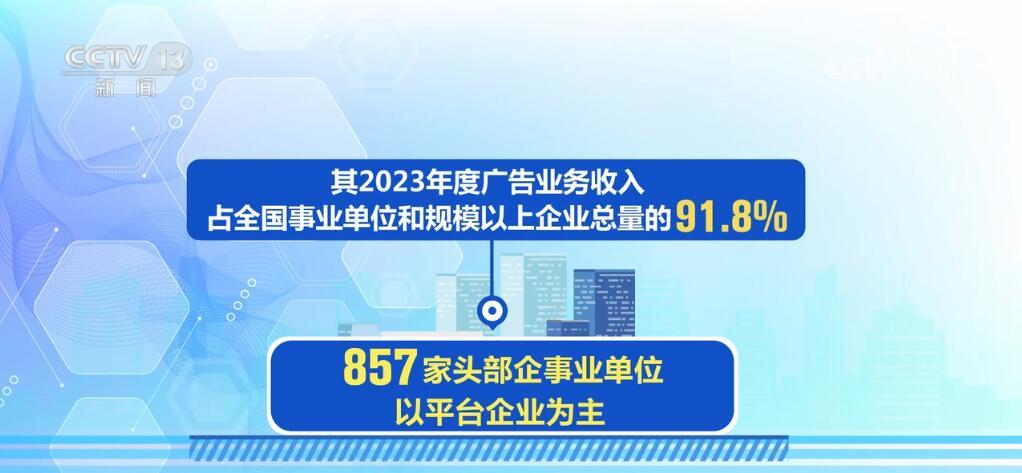 据了解,857家头部企事业单位以平台企业为主,数据显示其2023年度广告业务收入占全国事业单位和规模以上企业总量的91.8%。其中,头部平台企业广告业务收入占其营业收入50%以上。平台企业的广告业务不仅带动广大中小微广告企业构建起产业链,也为其开展人工智能、新能源、云计算等技术创新提供了资金保障。