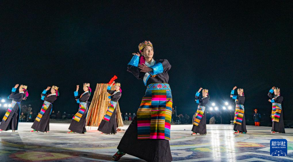 舞蹈演员在纳木错开湖篝火晚会现场表演(5月18日摄)。