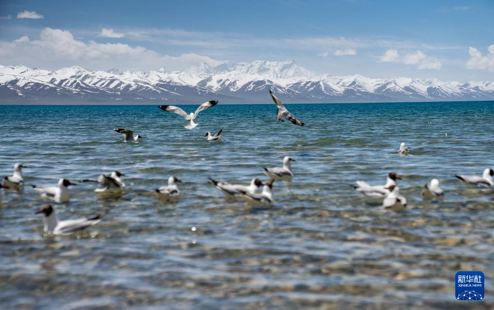 一群棕头鸥在冰雪消融的纳木错湖面停留(5月19日摄)。