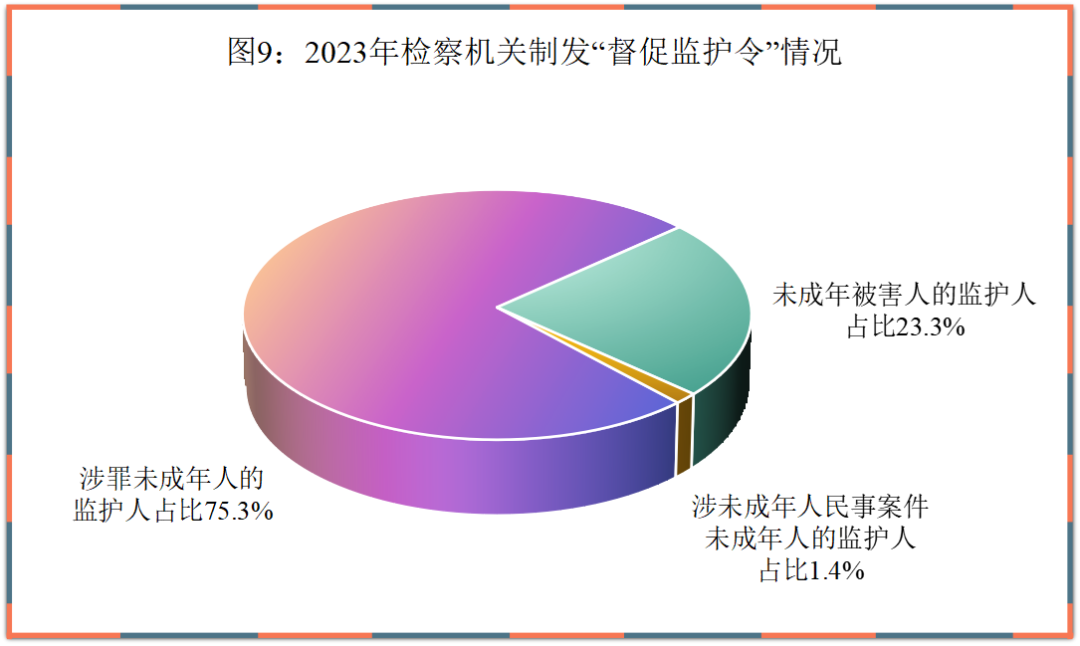 1. 开展“督促监护令”工作情况。2023年,全国检察机关结合办案,针对性督促、引导监护人履行监护职责,共制发“督促监护令”5.7万份。其中,向涉罪未成年人的监护人制发“督促监护令”4.3万份,向未成年被害人的监护人制发“督促监护令”1.3万份,探索向涉未成年人民事案件未成年人的监护人制发“督促监护令”800余份。
