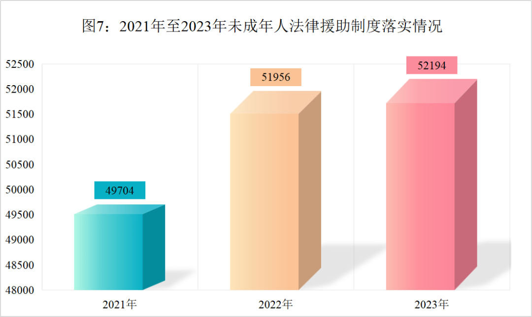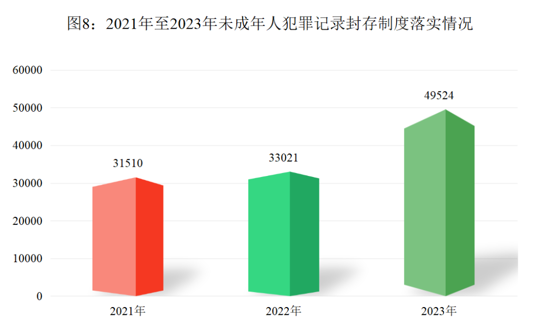 (5)未成年人法律援助、犯罪记录封存制度适用向好。2023年,认真落实未成年人刑事案件诉讼程序和特殊保护制度,全国检察机关通知为未成年犯罪嫌疑人提供法律援助52194人次,对符合条件的未成年人落实犯罪记录封存49524人,同比分别上升0.46%、49.98%。