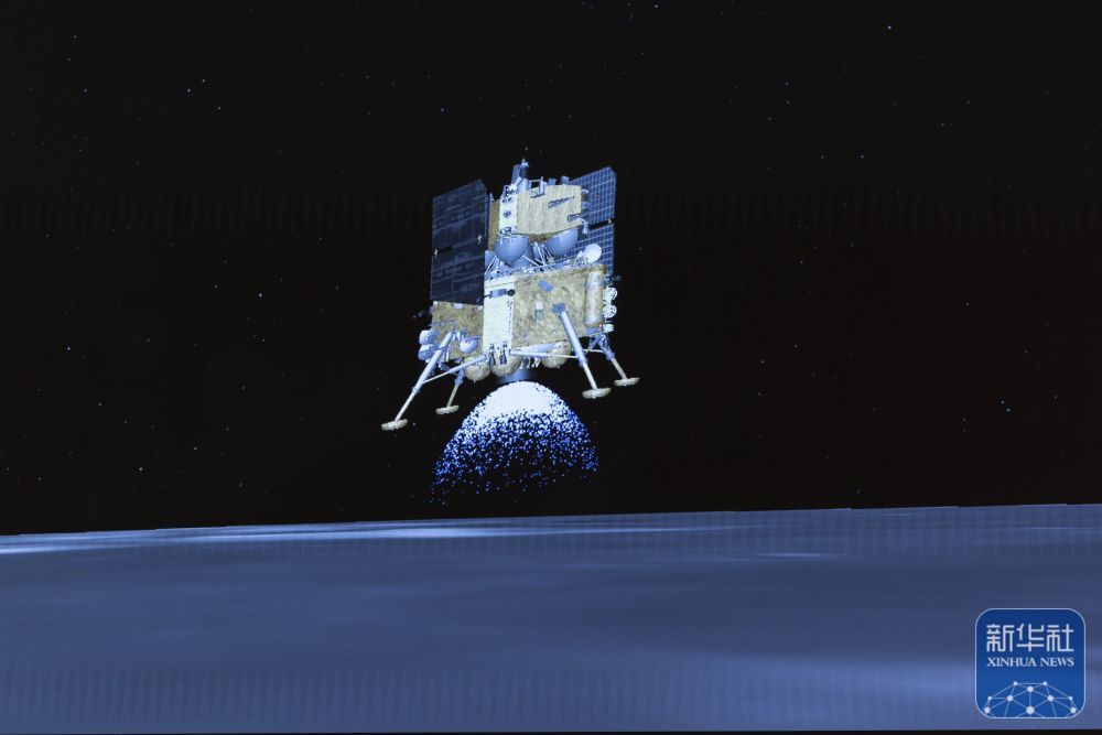 这是6月2日在北京航天飞行控制中心屏幕上拍摄的嫦娥六号着陆器和上升器组合体着陆月背的模拟动画画面。