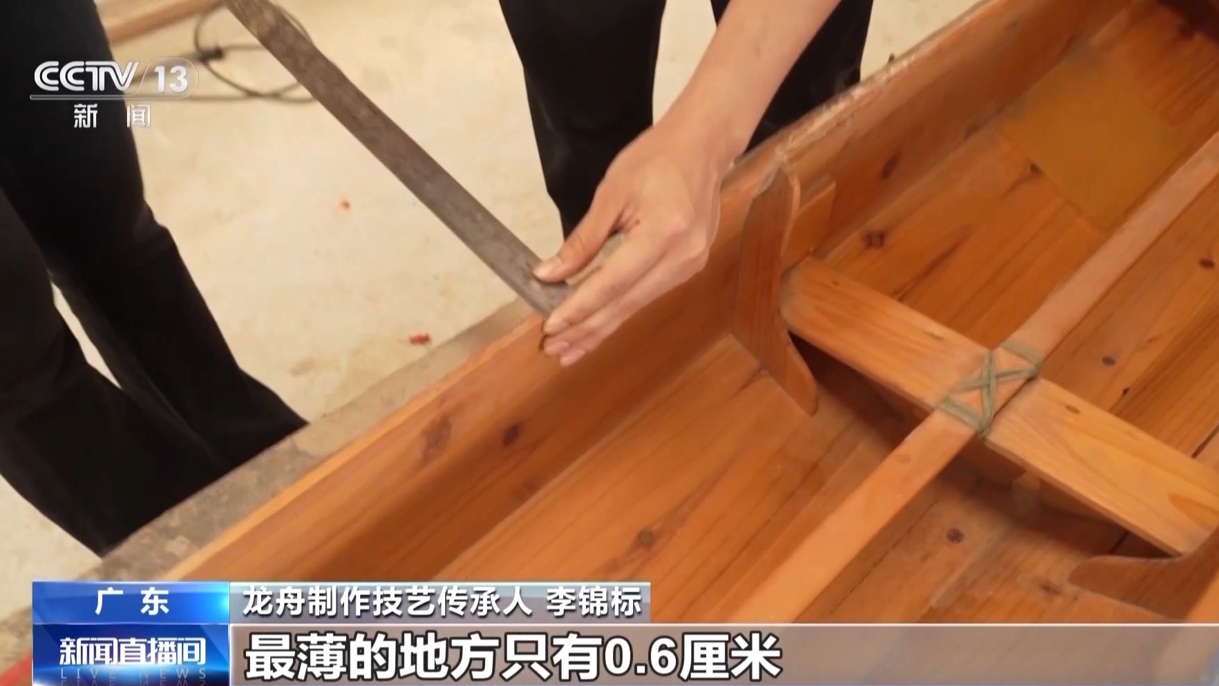 龙舟制作技艺(三水洲边)传承人 李显文:最薄的木材用到1.3厘米的厚度,最厚的木材人家是4.5厘米厚的,我是3.5厘米,就等于把整条木材降低了530斤。船身宽度原来是1.15米,我是做了1.07米的宽度,划动速度100米/秒。