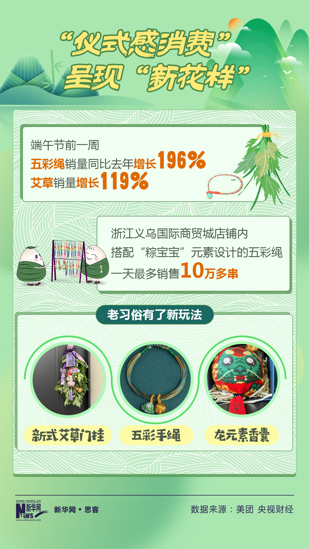 美好生活离不开仪式感。这个端午假期,艾草、香囊、五彩绳等端午节令元素不仅让节日氛围“拉满”,也让人们体验到“仪式感消费”的文化价值。一方面反映了消费市场的创新与变化,另一方面也顺应了居民消费结构升级的大趋势,更为经济恢复发展注入了新动能。