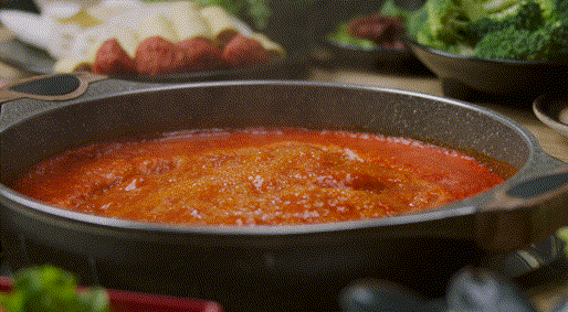 和川渝的牛油锅不同,辣糊糊的锅底是用生辣椒面和孜然、十三香等香料调配加鸡汤熬煮。