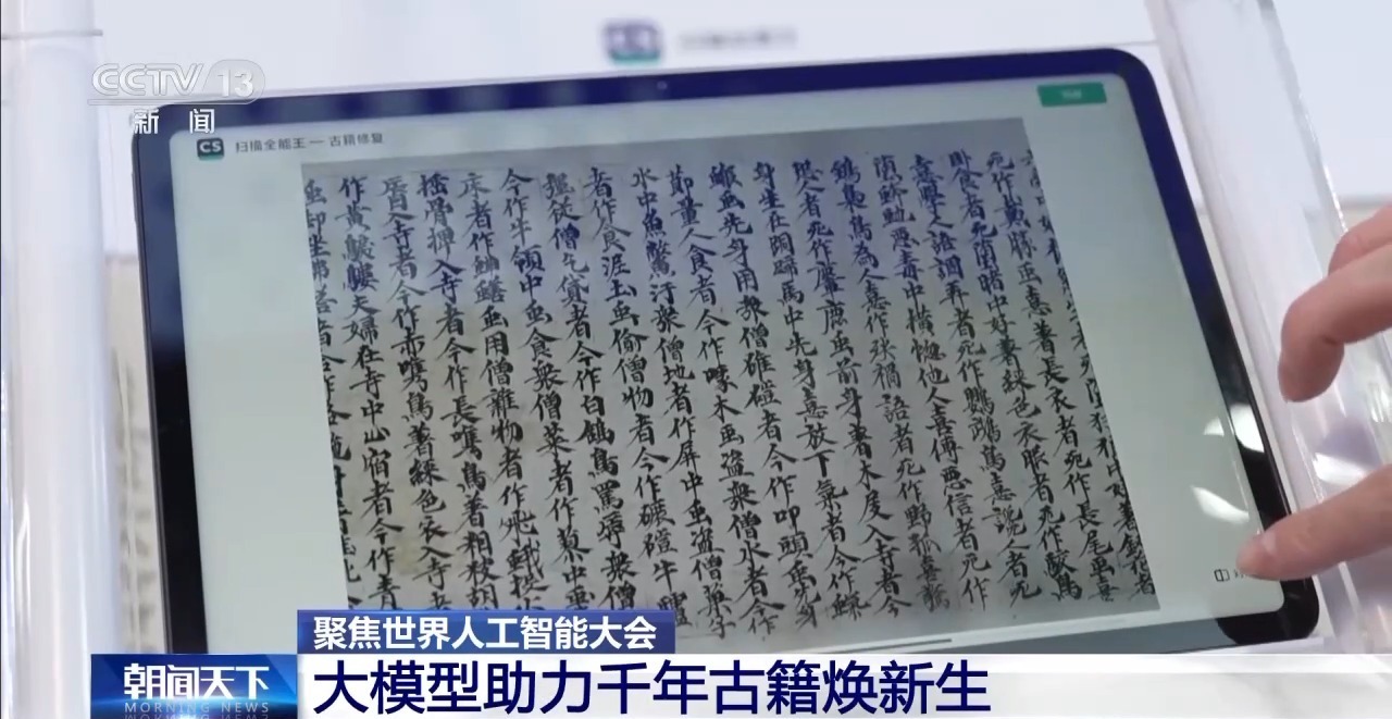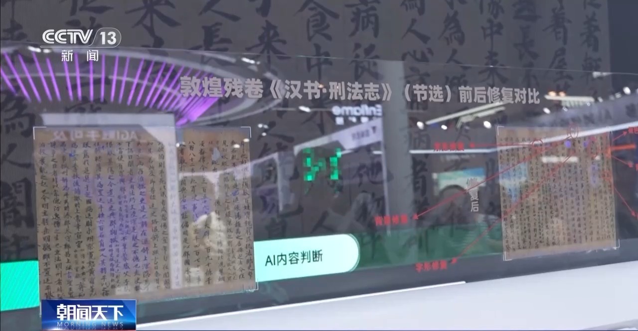 参展商 刘忱:通过AI方式去了解海量的古籍风格、背景、笔法,去做到古籍的1∶1还原。目前复杂场景的AI古籍修复技术不止用在考古领域,也已经走进千家万户,帮助社会公众去解决文档破损的问题。