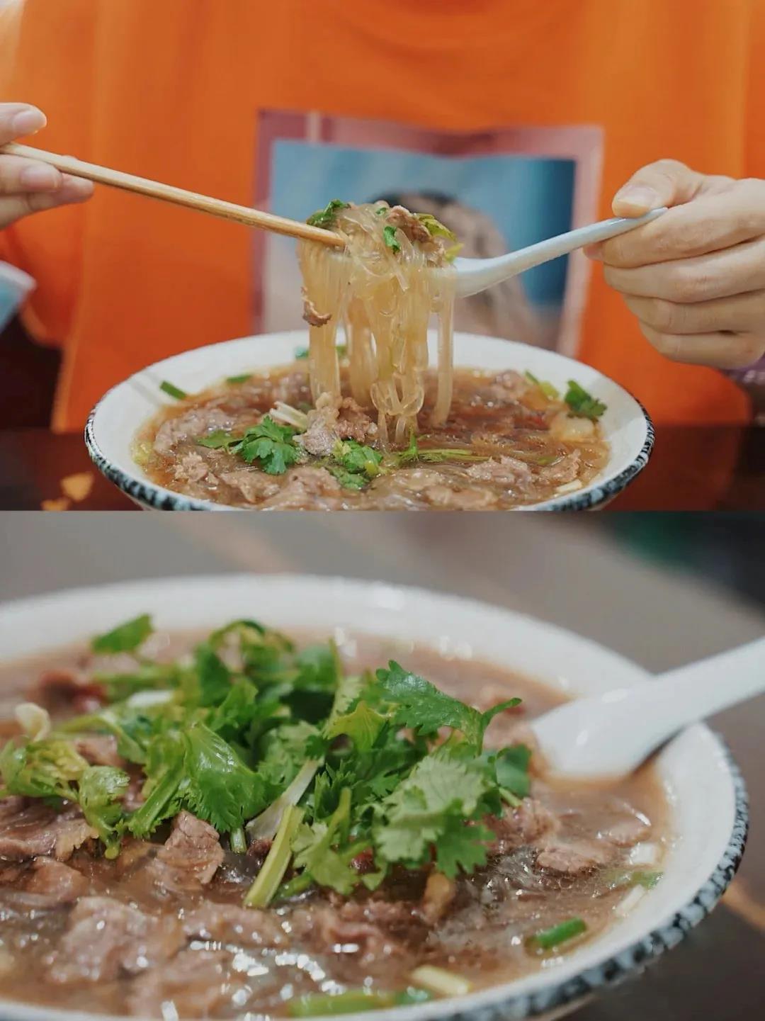 “干面”不是指干的面,而是特指番薯粉丝制作的牛肉粉条。牛肉干面每一口都挂满汤汁,一口接一口,绝对浑身舒畅。