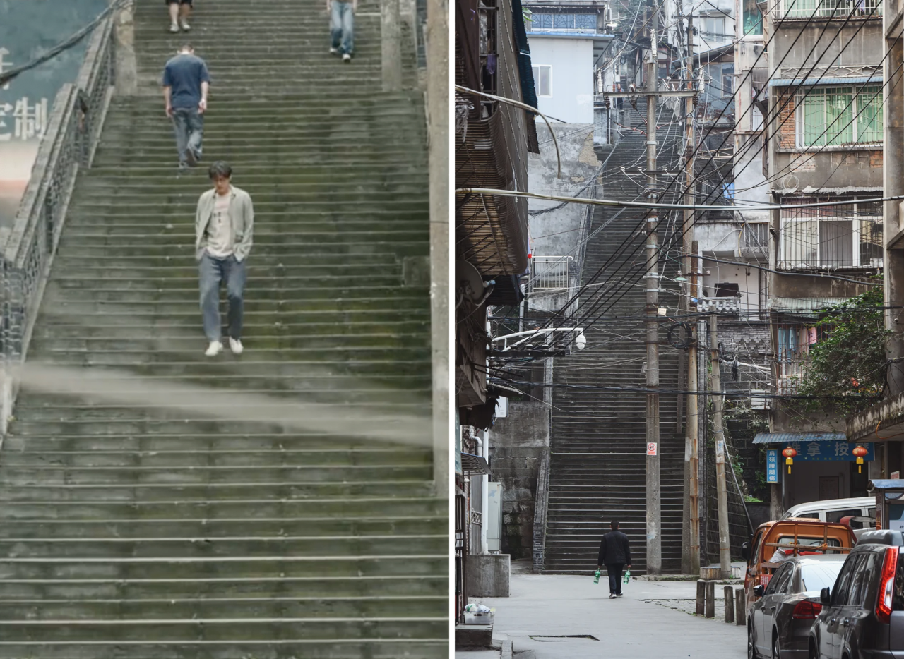△电影中的大梯巷截图(左)与大梯巷实景图(右)