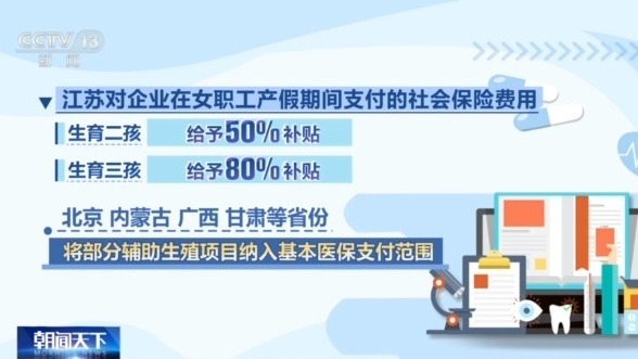 江苏则对企业在女职工产假期间支付的社会保险费用,生育二孩、三孩的分别给予50%、80%的补贴。北京、内蒙古、广西、甘肃等省份将部分辅助生殖项目纳入基本医保支付范围。
