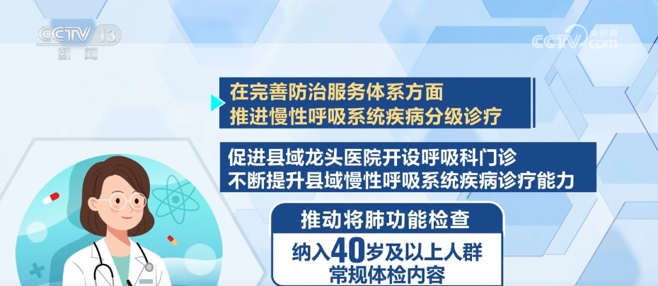 在完善防治服务体系方面,推进慢性呼吸系统疾病分级诊疗。促进县域龙头医院开设呼吸科门诊,不断提升县域慢性呼吸系统疾病诊疗能力。推动将肺功能检查纳入40岁及以上人群常规体检内容。提倡40岁及以上人群或慢性呼吸系统疾病高危人群每年检查1次肺功能,提高质量控制水平,提供城乡社区居民可及的肺功能检查服务。