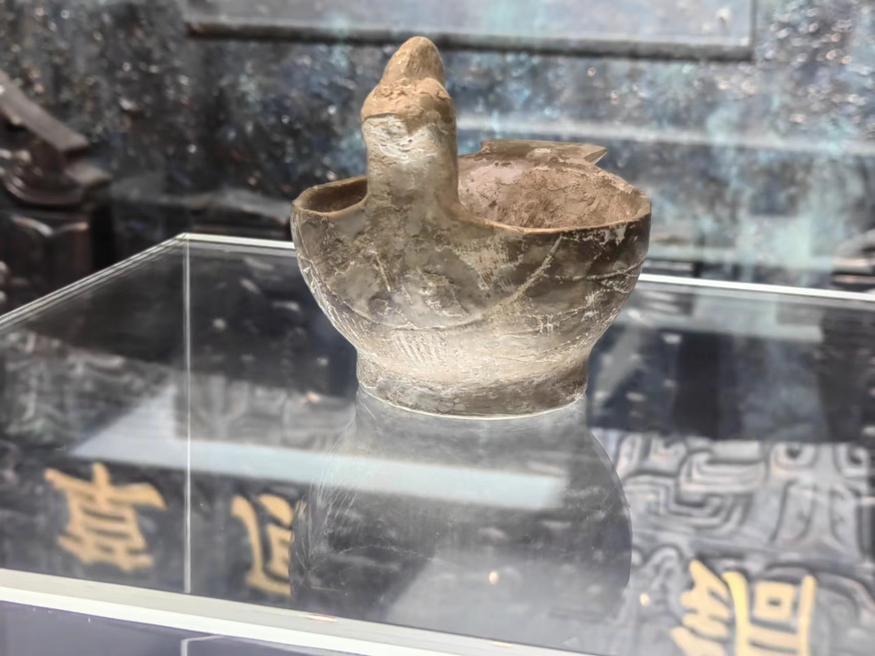 此外,展馆里还摆放了“中华第一凤”。这件陶凤杯诞生于新石器时代中期的赵宝沟文化。《尔雅》中记载,凤的雏形是鸡头、鱼尾。这件陶凤杯将凤的雏形完全显现,这在史前文物中是首次发现。