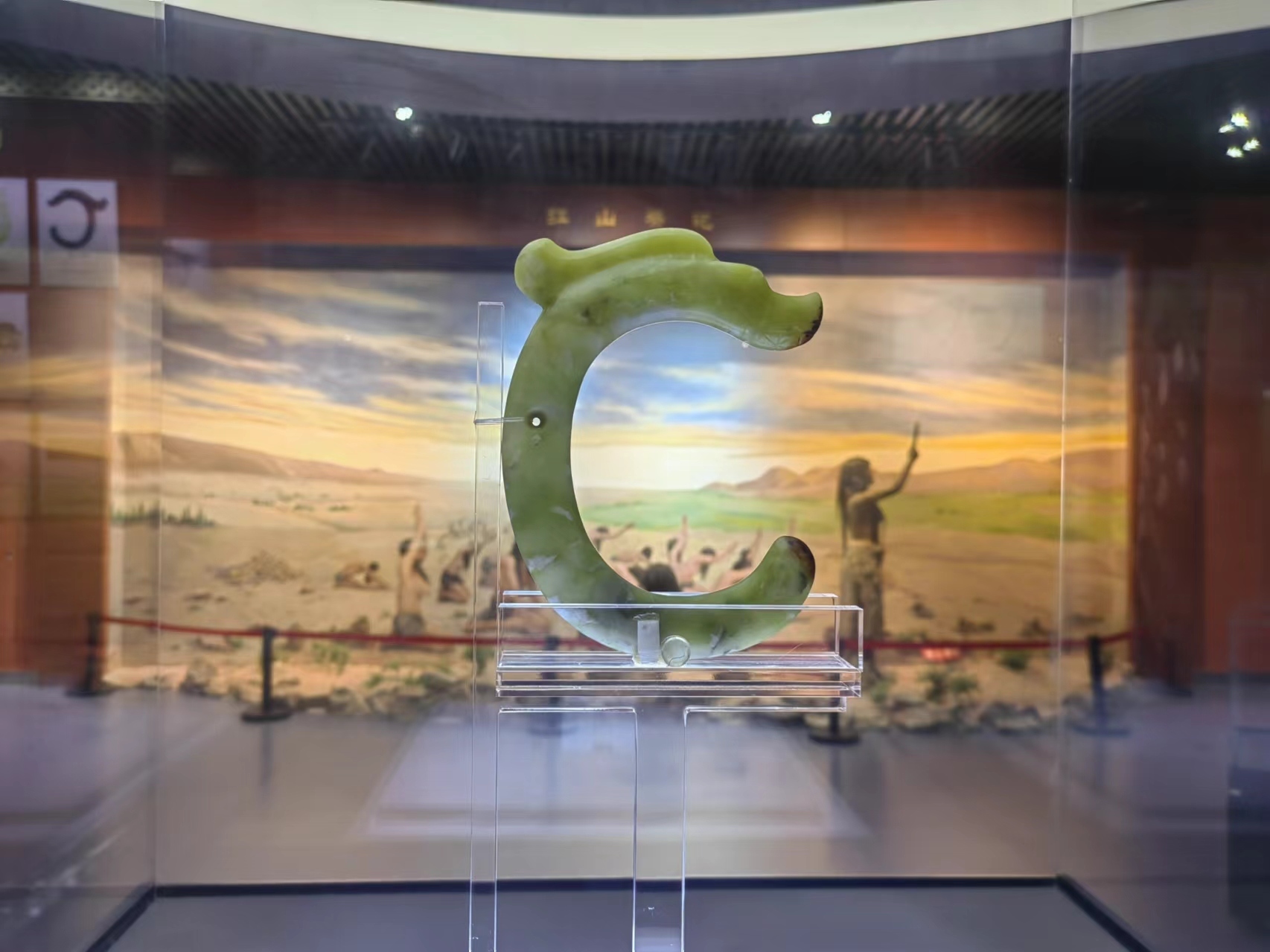 在前往翁牛特旗博物馆的路上,工作人员对记者团科普了“中华第一龙”的由来。1971年初秋的一天,赤峰市翁牛特旗三星塔拉村村民张凤祥在干农活时,挖出了一块“锈铁钩”。张凤祥把它送给弟弟用绳子拖着玩。过了几天,“铁钩”上的土锈渐渐脱落,露出墨绿色的晶莹质地,一条精美的玉龙就这样面世了……张凤祥的父亲张金贵觉得这不是一块普通的石头,便带着它走了几十里路,上交给了翁牛特旗文化馆,旗文化馆的领导仔细鉴定后用30块钱完成了收购。1984年,辽宁朝阳牛河梁红山文化遗址群的发现,掀起了对红山玉文化的关注高潮,在这种文化氛围中,翁牛特旗文化馆负责人贾鸿恩带着这块玉龙乘坐火车到了北京,找到当时中国考古学会理事长苏秉琦。苏先生和故宫博物院相关专家鉴定后,一致认为:这是五千多年前红山文化时期的墨玉龙,距今6500年到5000年左右,是当时中国发现的最早的龙形玉器。专家们还认为,这件墨玉龙雕工精细,选材优良,神态栩栩如生,形体酷似甲骨文中的“龙”字,这也证实西辽河流域同长江流域、黄河流域一样,在五千多年前就出现了中华文明的曙光。它的发现,为商代妇好墓出土的玉龙找到了更早的源头,因此碧玉龙也被誉为“中华第一玉龙”,赤峰也因而有了“中华玉龙之乡”的美誉。1989年,为了庆祝中华人民共和国成立40周年,碧玉龙被调往北京展览,并被永久收藏于中国国家历史博物馆。