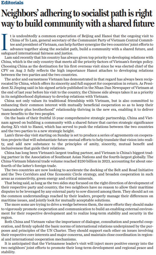 此次访华是苏林自8月3日当选越共中央总书记以来的首次外访,彰显了越方对发展两党两国关系的高度重视。对于越方展现出的热情与诚意,中方给与积极回应,全力支持双方合作。