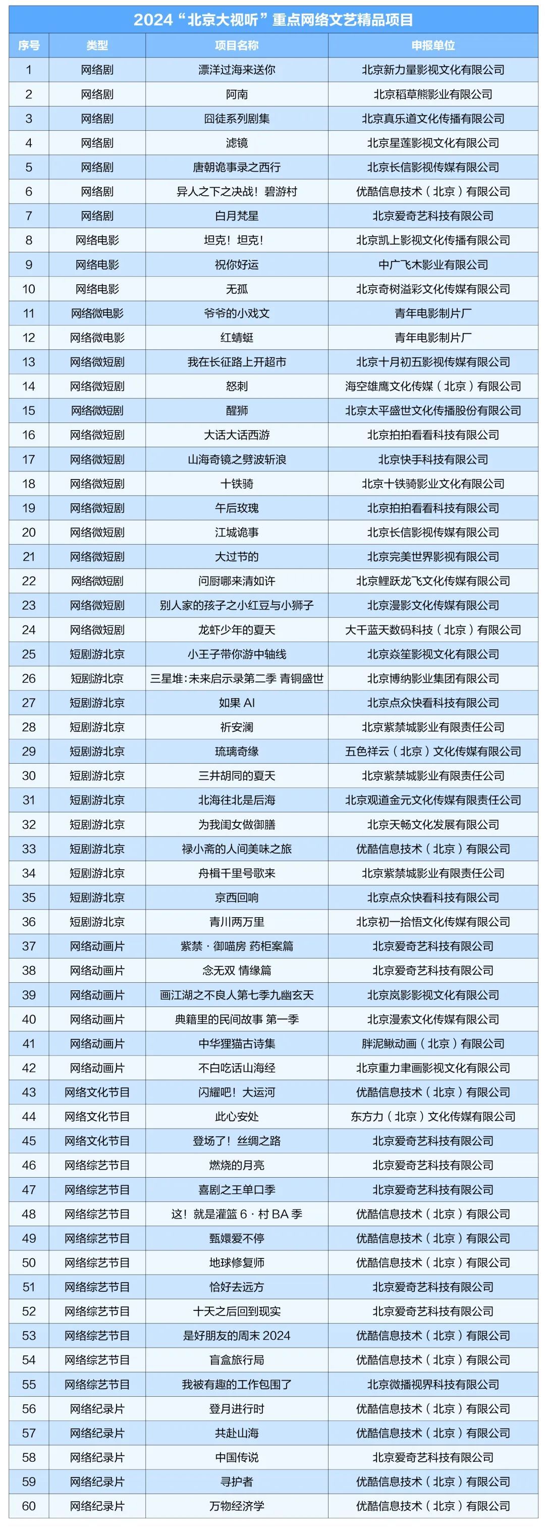 开幕式举行了2024“北京大视听”重点网络文艺精品项目发布仪式,60部入围作品现场发布,涵盖网络剧、网络电影、网络微短剧、短剧游北京、网络动画片、网络文化节目、网络综艺节目、网络纪录片等8个类别。