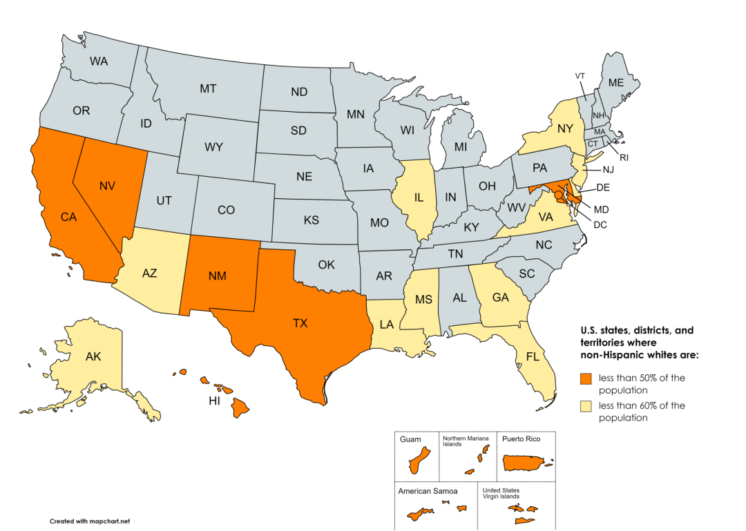 佐治亚州已经成为少数族裔占主体的州,夏威夷长期以来都是亚裔人口为主。得克萨斯州、内华达州与加州等也都是少数族裔占主体的州。