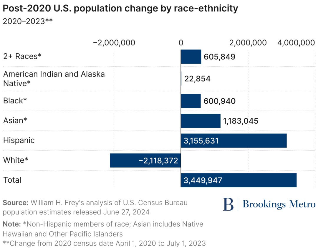 我引用一组数据,供大家参考:根据美国人口普查局的数据(2018),拉美裔人口中人数最多的年龄是11岁,而白人中人数最多的年龄是58岁。这组数据能够清楚地显示未来的趋势。在最近一次人口普查(2010-2020年)中,白人人口首次出现了下降,减少了1%,这是自美国开始进行人口普查以来的首次下降。这意味着,过去十年中,美国人口的增长主要由少数族裔推动。
