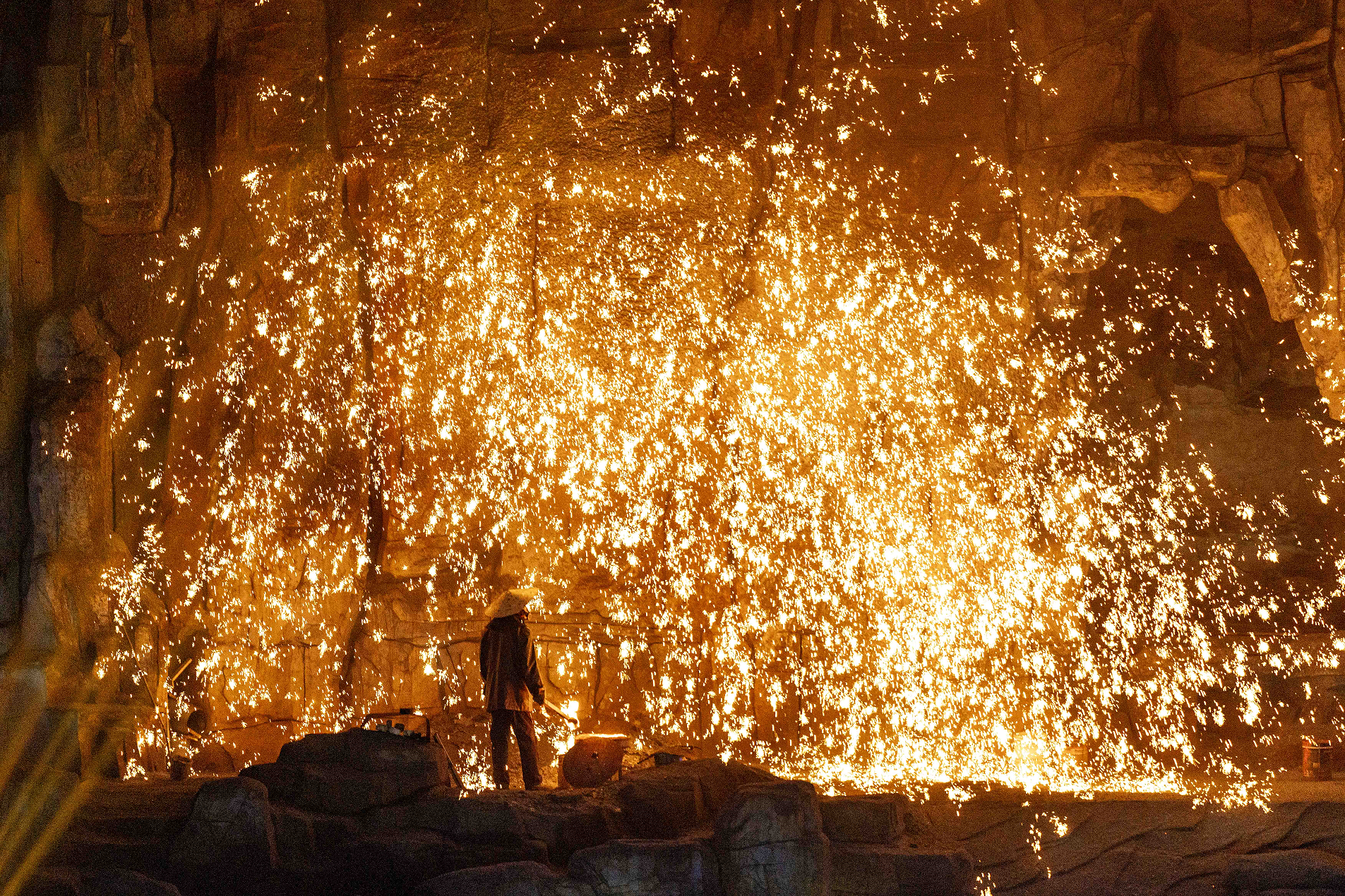 如今,司徒小镇打铁花剧目《千年铁魂》的花样多,铁花从十几米的假山高处打下来,100多人一起打,可以旋出圆圈,打出不同的造型,壮观程度不可同日而语。