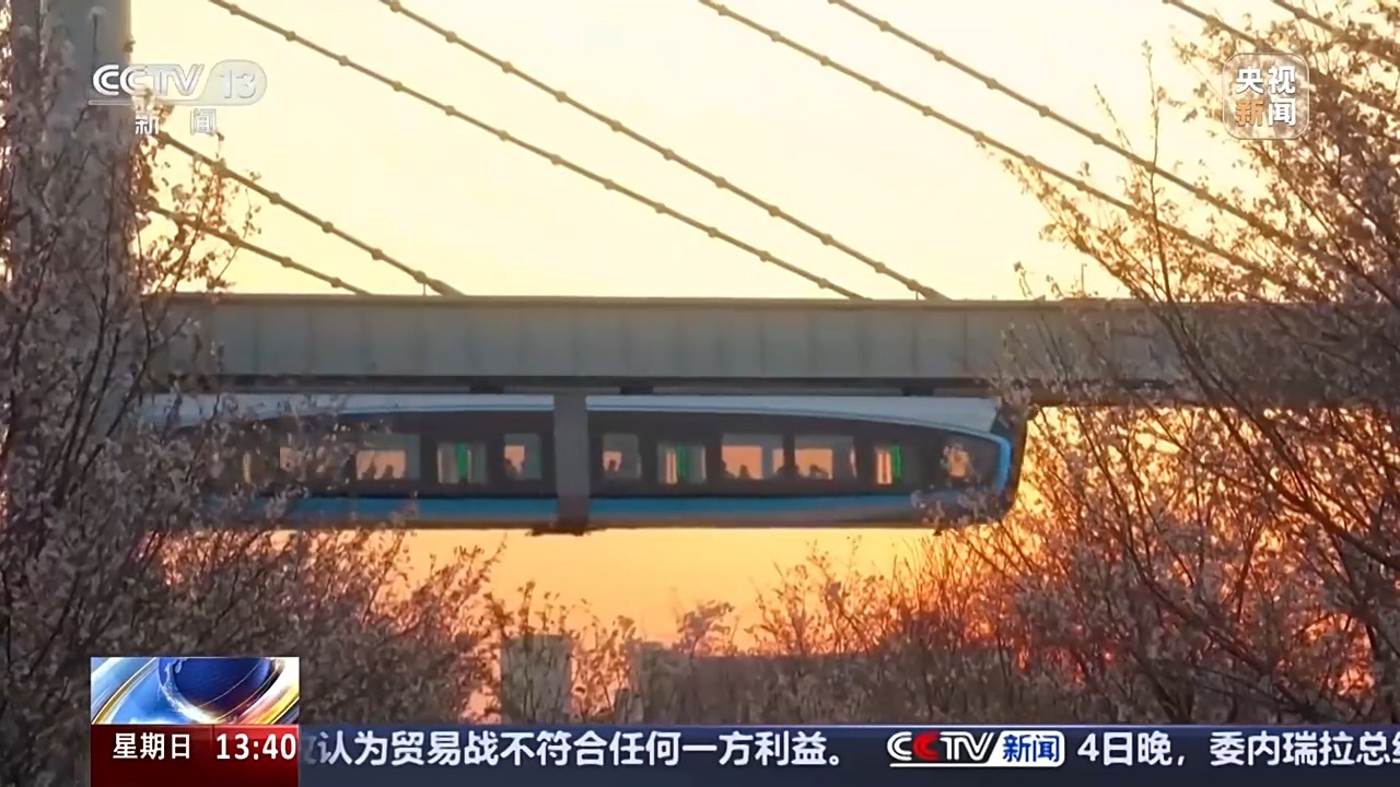 看过花、跨过海,到湖北武汉去看一看,我国首条悬挂式空中轨道列车,在生机盎然的春天里,有着怎样的独特风景?