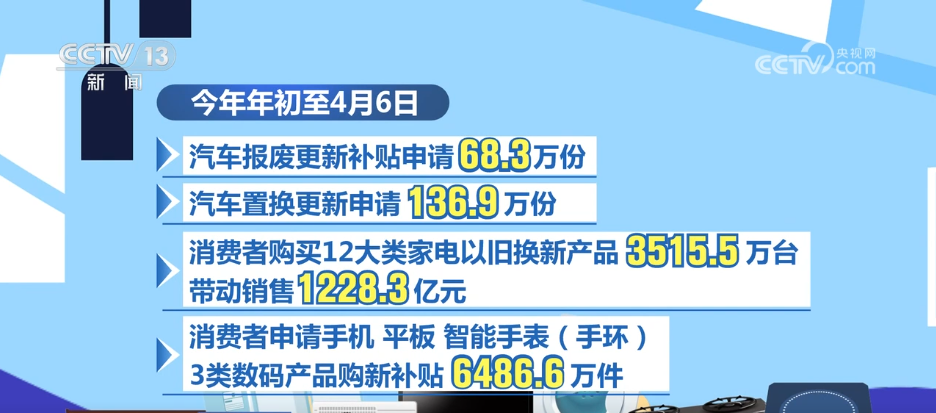 以旧换新持续显效。假期期间,商务部重点监测零售企业家电、通信器材、汽车销售额分别增长21.6%、15.1%和8.6%。今年年初至4月6日,汽车报废更新补贴申请68.3万份,汽车置换更新申请136.9万份;消费者购买12大类家电以旧换新产品3515.5万台,带动销售1228.3亿元;消费者申请手机、平板、智能手表(手环)3类数码产品购新补贴6486.6万件。