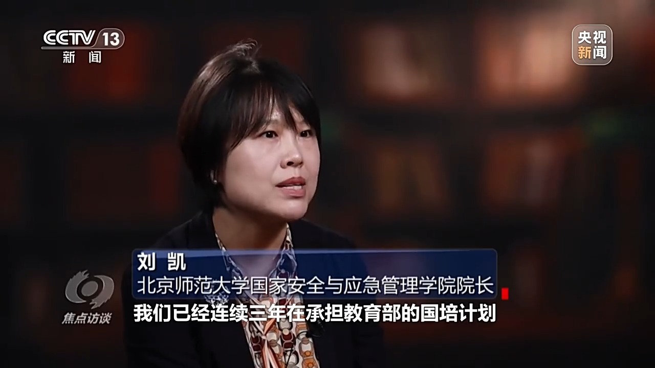 北京师范大学国家安全与应急管理学院院长 刘凯:我们已经连续三年承担教育部的国培计划。国培计划就是给全国的中小学教师讲授国家安全相关的基本知识,等他们回到自己的学校,在他们日常授课的时候,就能够把国家安全的知识融入数学课程、物理课程,包括其他一些课程中,这是一个非常可持续的路径。