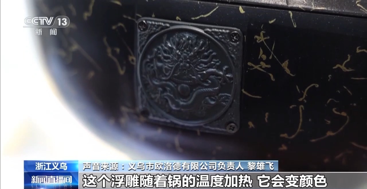 义乌市欧洛德有限公司负责人 黎雄飞:这个锅,我们加了中国的传统元素。比如我们做了一个浮雕,这个浮雕随着锅的温度加热,会变颜色,所以国人就知道什么时候该放油了,什么时候该炒菜了。