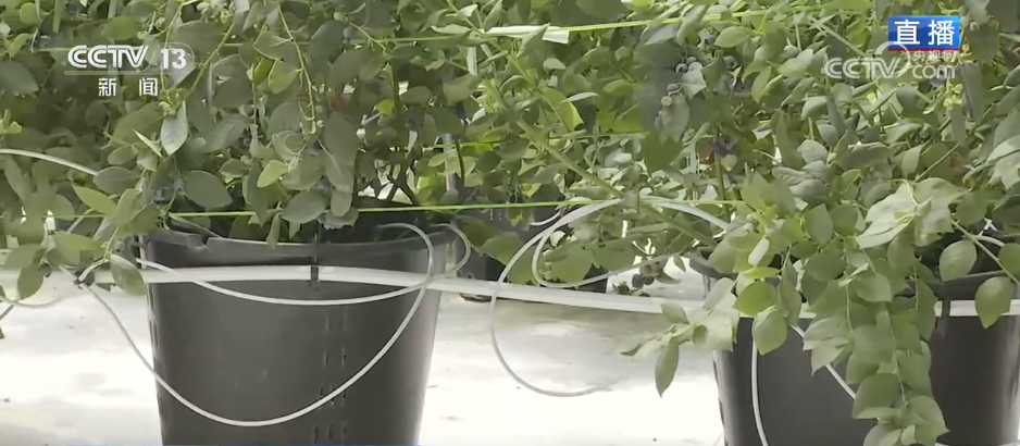 这样的一座现代化大棚里,除了温度、湿度、光照的控制全部自动化以外,还有很多最新种植方式被使用。在这片蓝莓树的底部有特殊灌溉管道,看上去特别像给树干“打吊瓶”,其实这些树木非常健康,这些看似输液管道的设备叫做“滴箭”,和传统的“滴灌”灌溉系统不同,“滴箭”形似一个箭头,尖锐的头部方便深扎入土壤,而中空的箭杆里则可以不断向植物根部输送水和水溶性肥料。和传统的滴灌在土层表面浇水不同,直接将水“扎入”根部会减少水在土壤表层的蒸发,降低大棚内湿度。湿度降低后,害虫也很难繁殖,病虫害降低到很低程度,自然不用使用农药灭虫,从而实现了整个大棚内的果蔬产品绿色有机。