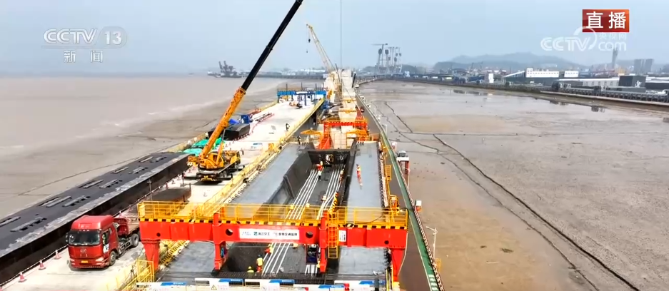 回到现场,记者站立的位置是刚刚浇筑完成不久的箱梁之上,从这儿向下望去,距离海面还有54米之高,大型的吊装车正在将一捆捆钢筋吊装进这台大型的设备之中,这台机器就是浇筑桥面的主要工具——移动模架,简单来说,它就是一个巨大的模具,施工人员将混凝土浇筑进模具中,等待凝固成型后模具通过下方的轨道脱离,留下的就是一块一块的箱梁,也就是大桥主梁。移动模架选用的模版采用的不是木板,也不是普通的铁板,而是不锈钢模板。这样浇筑出来的箱梁表面平滑,板拼缝处理更精细,漏浆风险变少,提高了整个混凝土箱梁的整体性。