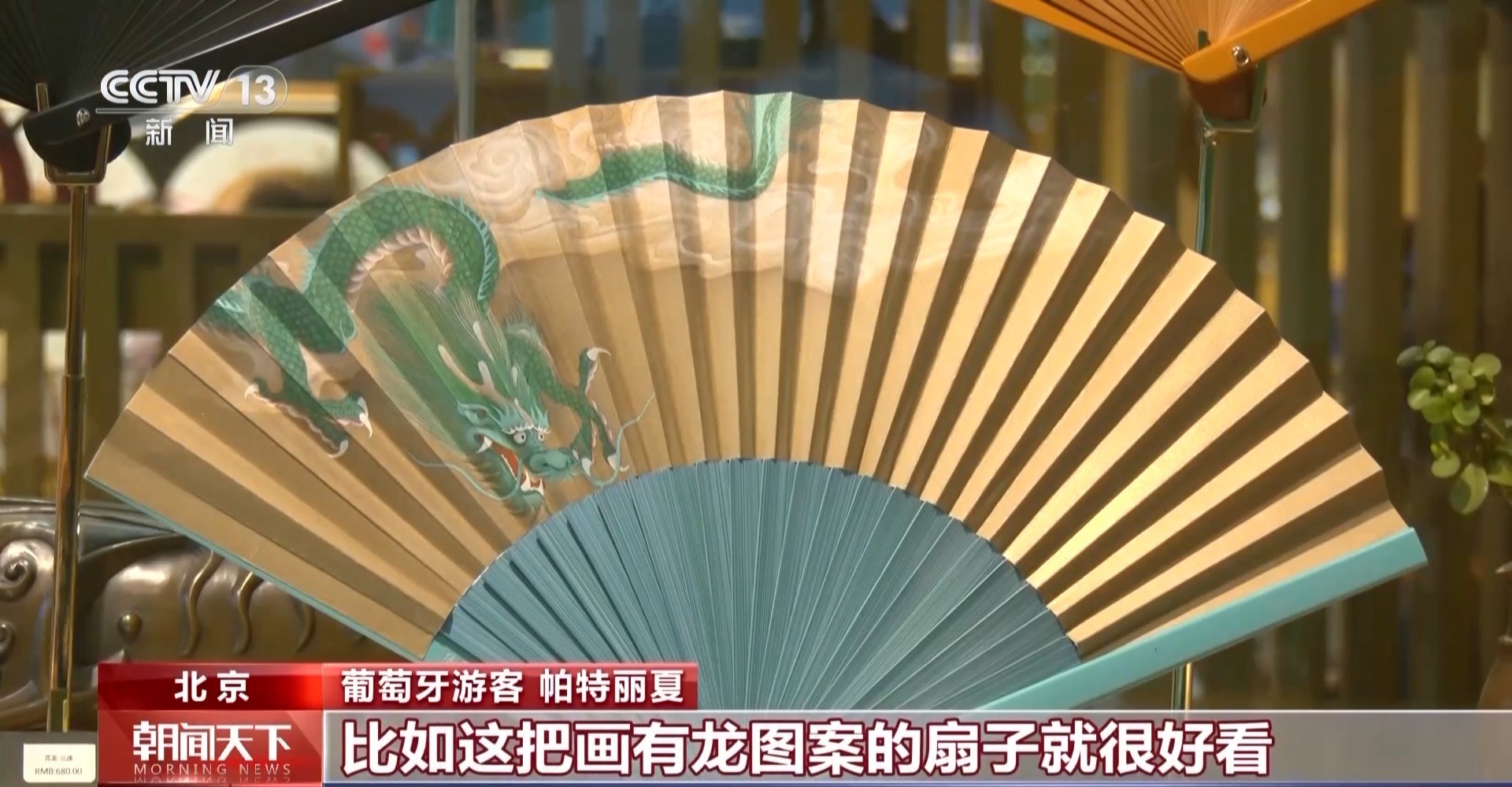 葡萄牙游客 帕特丽夏:我很喜欢中国的文化,这些商品都很有特点,比如这把画有龙图案的扇子就很好看,退税也给我们提供了优惠,我想多挑选一些,送给家人和朋友。