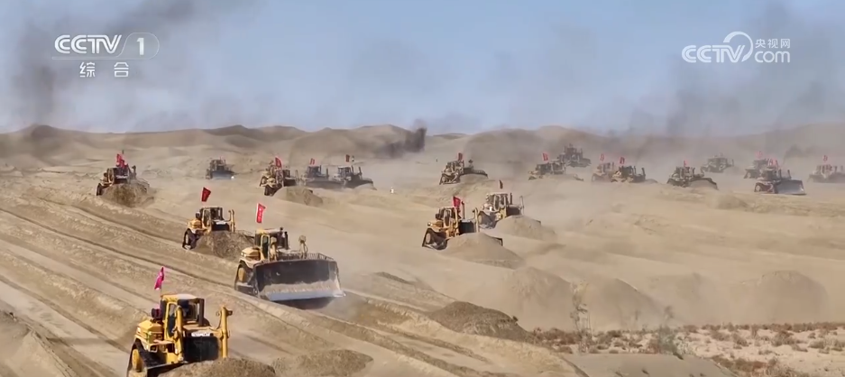 在位于塔克拉玛干沙漠南缘的新疆昆玉市,7.38万亩土地开发建设项目进入攻坚阶段。上百台装载机、平地机在沙海中来回奔忙,原本丘壑纵横的流动沙丘经过连续作业,逐渐变得平整,显露出田垄的轮廓。