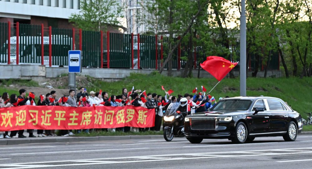 习近平乘车从机场赴下榻饭店途中,当地民众以及中资企业和留学生代表聚集在道路两旁,手持“热烈欢迎习近平主席访问俄罗斯”等红色横幅,挥舞中俄两国国旗,热烈欢迎习近平到访。