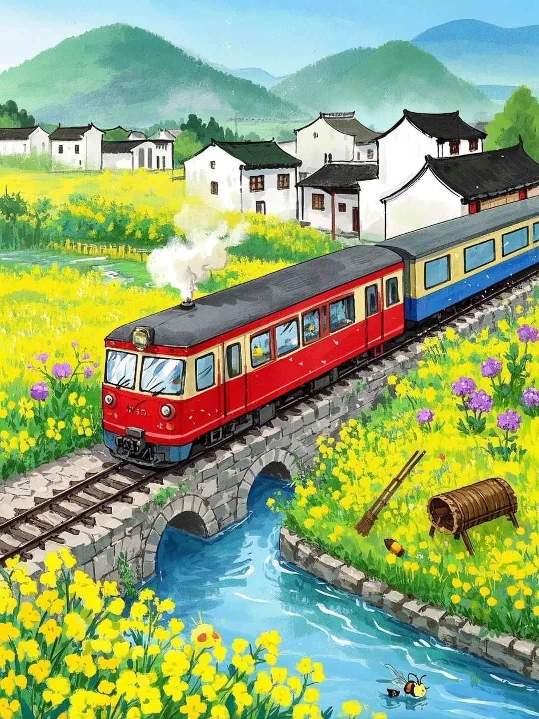 列车穿行于婺源油菜花田,青瓦白墙的徽派村落点缀其中,炊烟从马头墙后袅袅升起。