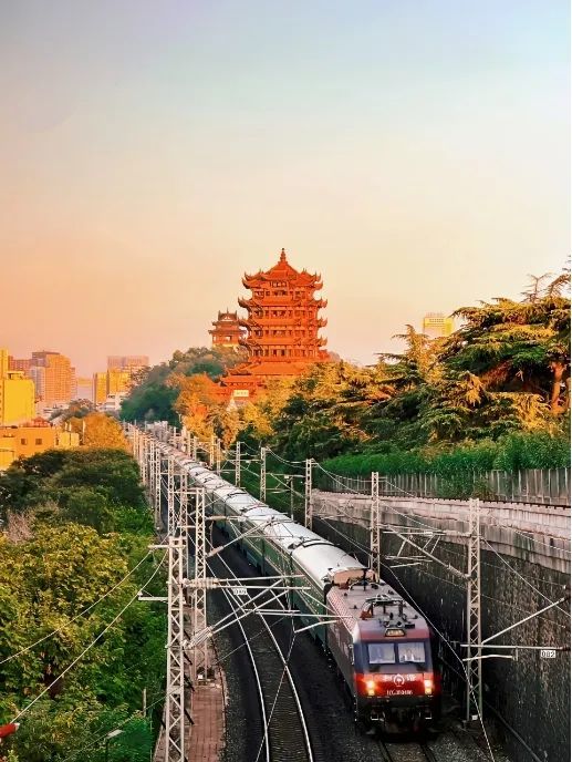 钢轨轻吟间,千年楼阁与现代列车绝美同框!车头刺破暮色时,黄鹤楼的飞檐正披着鎏金晚霞,檐角铜铃随气流轻晃,仿佛在和车窗里的旅客说“好久不见”。
