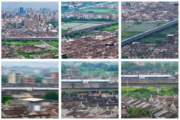 代表中国速度的高铁和潮汕独特的民居同框。高铁穿过这些古老的民居群落,让更多的人能够领略到潮汕民居的魅力。