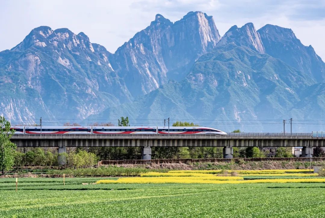华山上云雾缠绕,山脚下万亩绿麦翻涌着生机。一列高铁列车飞驰而过,现代速度在古韵山川与蓬勃田野中穿梭,绘就一幅绮丽景象。