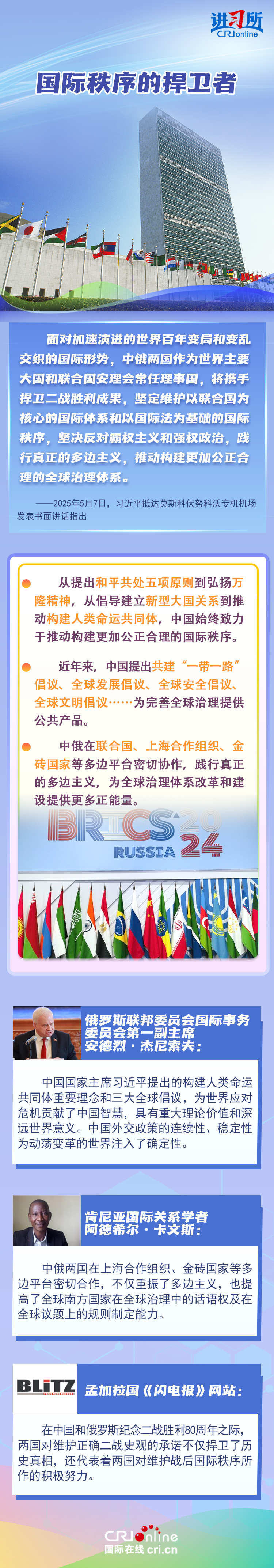“两国人民用鲜血和生命凝结的深厚情谊,如黄河之水奔腾不息,似伏尔加河宽广深沉,成为中俄世代友好的不竭源泉。”今年是中国人民抗日战争、苏联伟大卫国战争暨世界反法西斯战争胜利80周年,也是联合国成立80周年。在这一重要历史时间节点,习近平主席此访不仅为中俄关系发展注入强劲动力,也向世界宣示中俄两国携手捍卫二战胜利成果的坚定意志。