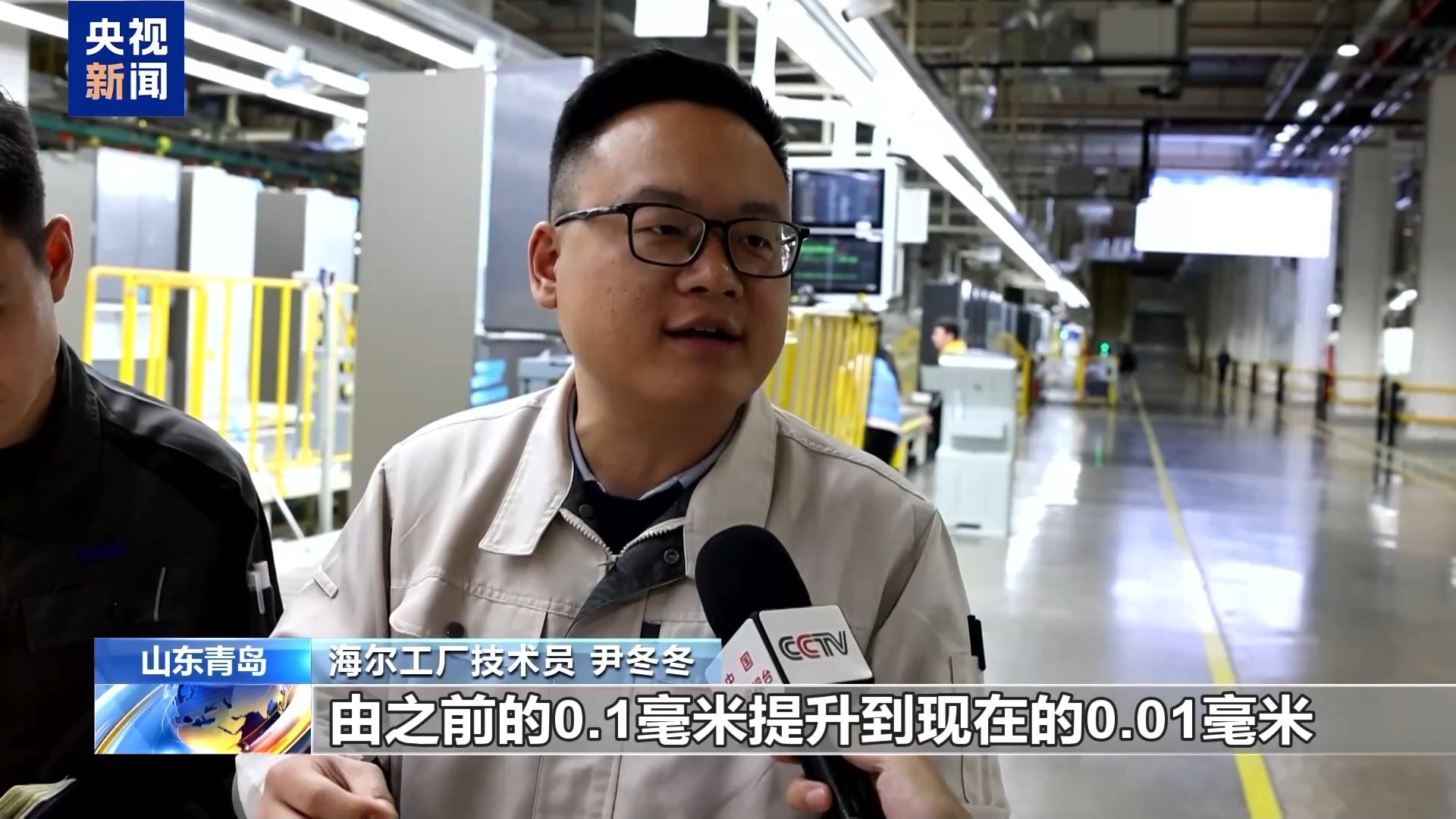 海尔工厂技术员 尹冬冬:AI识别使检测精度提高了10倍左右,由之前的0.1毫米提升到现在的0.01毫米,生产效率提升了40%左右。