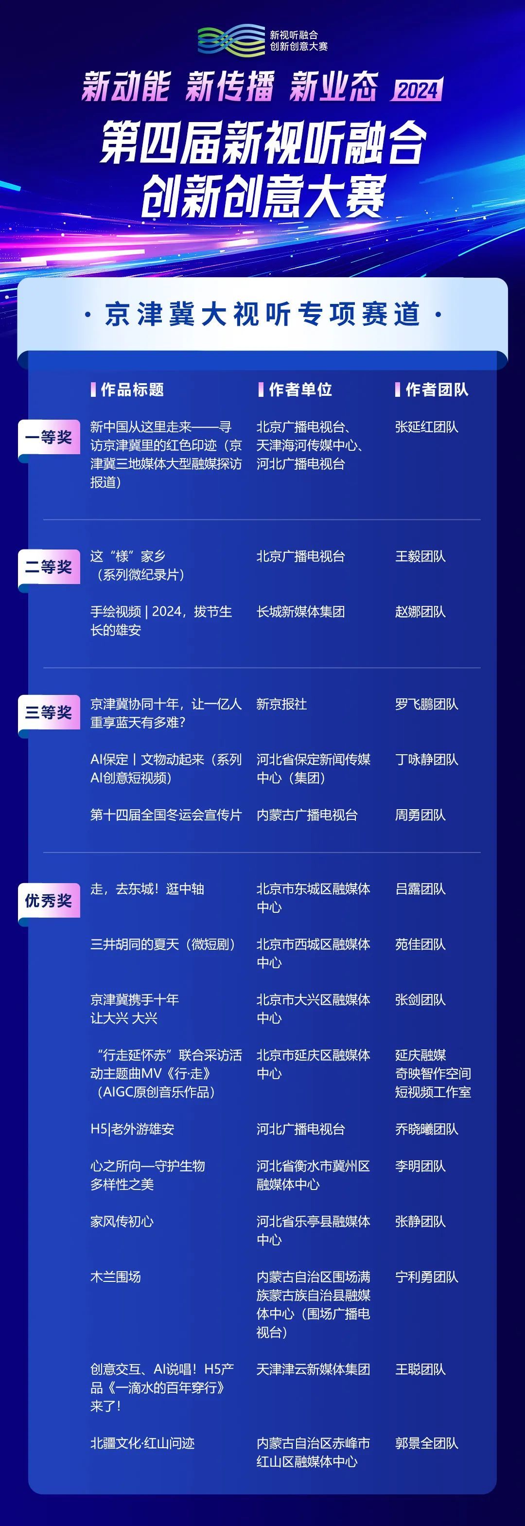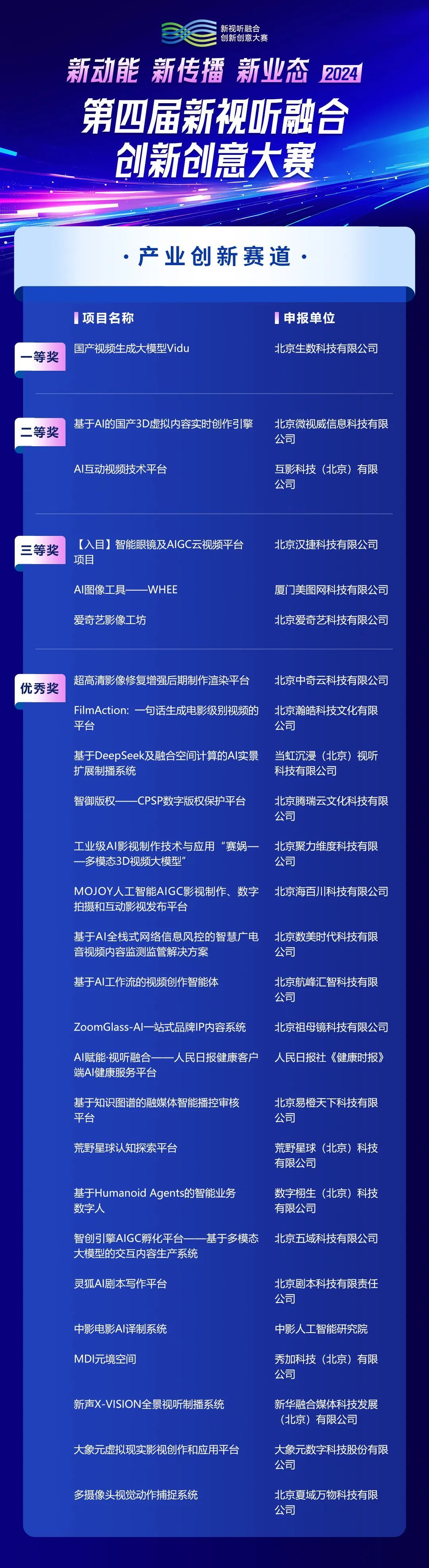 大赛由中共北京市委宣传部、光明日报社、北京市广电局、北京市新闻工作者协会共同主办,于2024年11月启动,汇聚全国368家单位、1279个作品和项目。经初赛、复赛评审及大赛组委会审议,选出“技术应用”“内容创意”“产业创新”三个公共赛道和“全国广电新媒体”“京津冀大视听”两个专项赛道获奖作品、项目。
