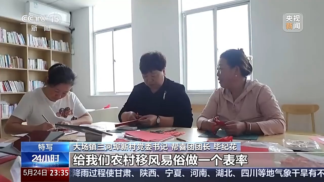 大场镇三河埠新村党委书记 帮喜团团长 毕纪花:刚开始的时候我们在一起剪纸,有一位大姐的儿子要结婚,我们当时就给纪大姐做工作,说她完全可以成为第一个吃螃蟹的人,给我们农村移风易俗做一个表率。