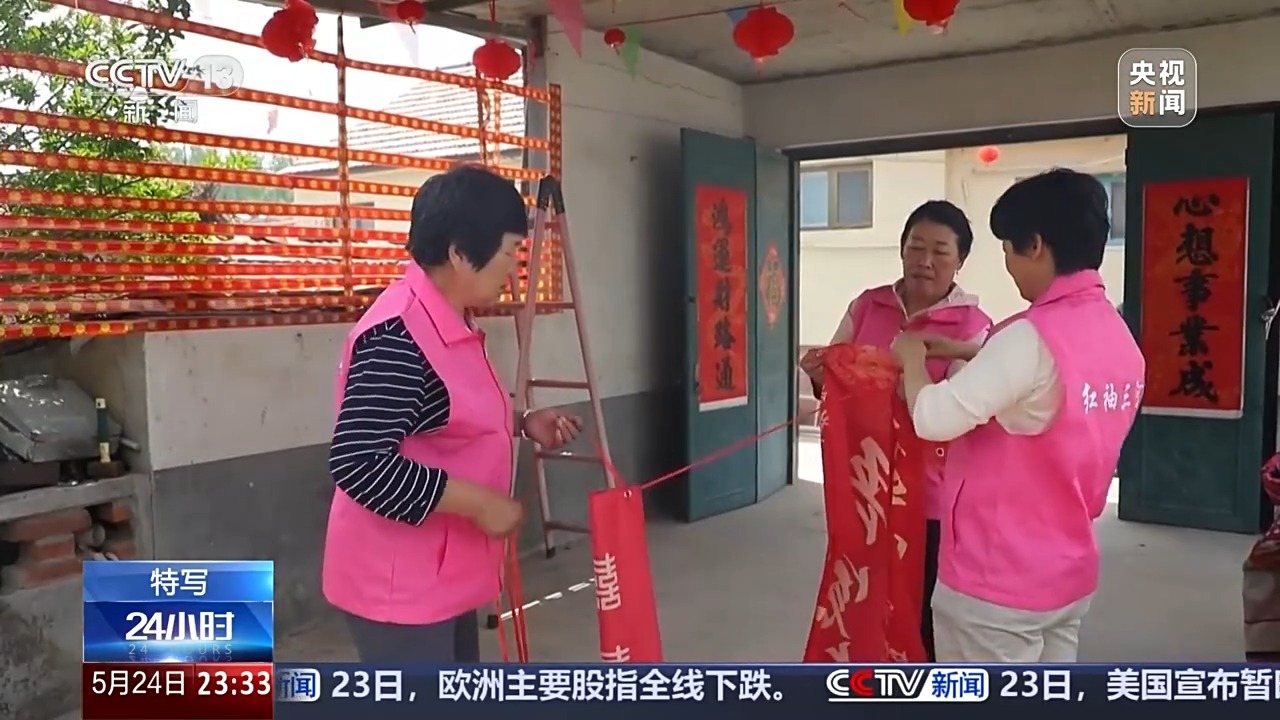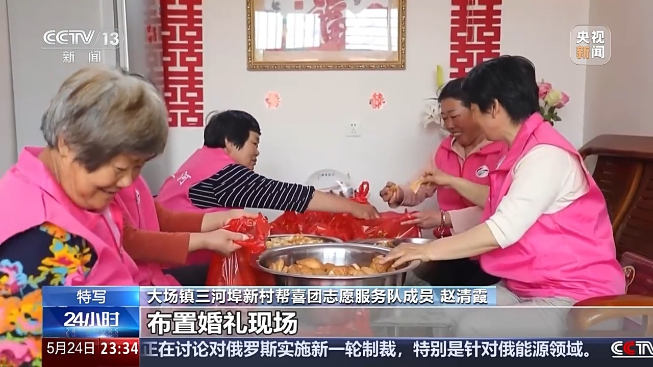 距离儿子的婚礼还有三天,三河埠村村民魏祥年家里已经忙碌起来。陪着老魏夫妇一起忙活的,除了亲友,还有好几位穿着粉色志愿服务马甲的大姐。
