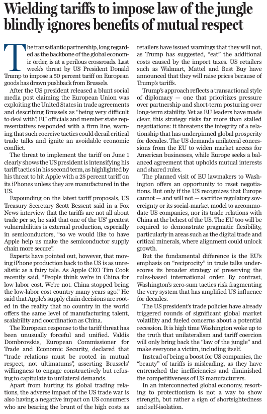 上周,美国总统特朗普威胁称,自6月1日起将对欧盟商品征收50%的关税。他在社交媒体平台发文,直言不讳地指责欧盟长期通过贸易协定榨取美国,并称与欧委会“极难打交道”。欧盟官员随即强硬回应,警告称,此类威胁可能导致至关重要的贸易谈判破裂,引发一场本不必要的经济冲突。