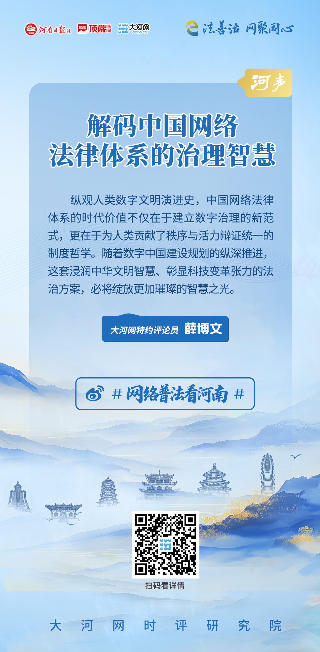 纵观人类数字文明演进史,中国网络法律体系的时代价值不仅在于建立数字治理的新范式,更在于为人类贡献了秩序与活力辩证统一的制度哲学。随着数字中国建设规划的纵深推进,这套浸润中华文明智慧、彰显科技变革张力的法治方案,必将在构建清朗网络空间的全球进程中绽放更加璀璨的智慧之光。(大河网特约评论员 薛博文)