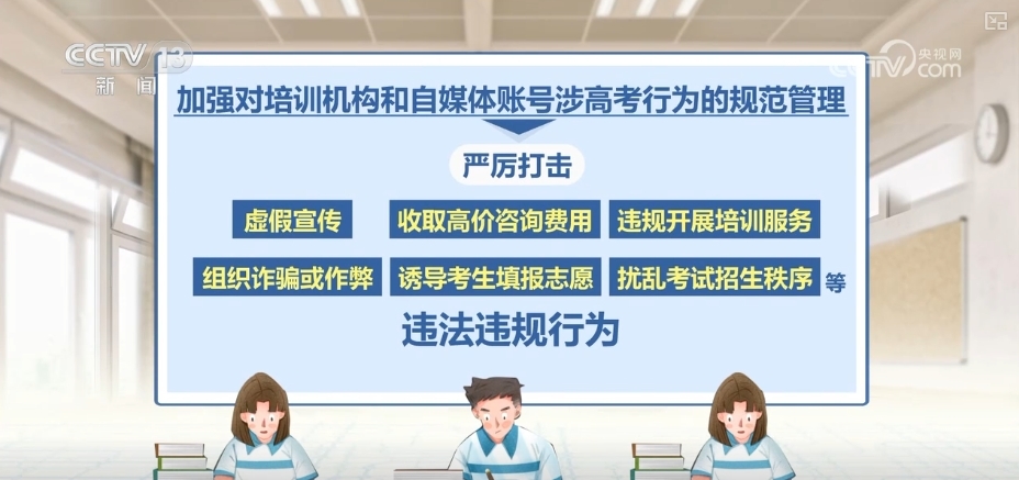 加强对培训机构和自媒体账号涉高考行为的规范管理,严厉打击虚假宣传、收取高价咨询费用、违规开展培训服务、组织诈骗或作弊、诱导考生填报志愿、扰乱考试招生秩序等违法违规行为。
