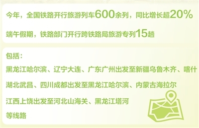 国铁集团数据显示:今年全国铁路已开行旅游列车600余列,同比增长超20%。端午假期,铁路部门开行跨铁路局旅游专列15趟,包括从黑龙江哈尔滨、辽宁大连、广东广州出发至新疆乌鲁木齐、喀什,湖北武昌、四川成都出发至黑龙江哈尔滨、内蒙古海拉尔,江西上饶出发至河北山海关、黑龙江塔河等线路。