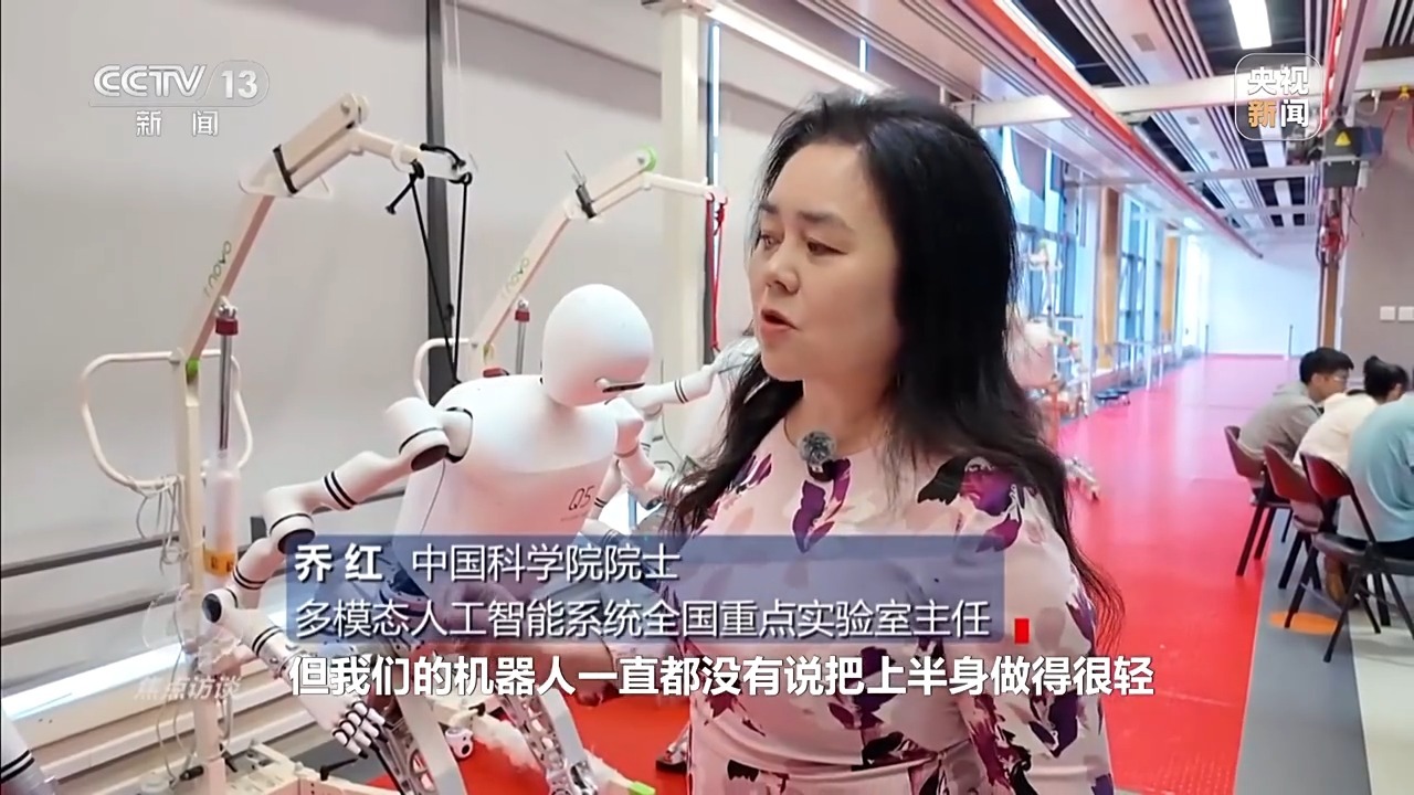 中国科学院院士、多模态人工智能系统全国重点实验室主任 乔红:人形机器人都是自由度(关节)比较多,但我们的机器人一直都没有把上半身做得很轻,因为它是要作业的、干活的,所以没有专门追逐要跑得快,跑得快也是我们的期望,现在也能跑2.2米每秒。