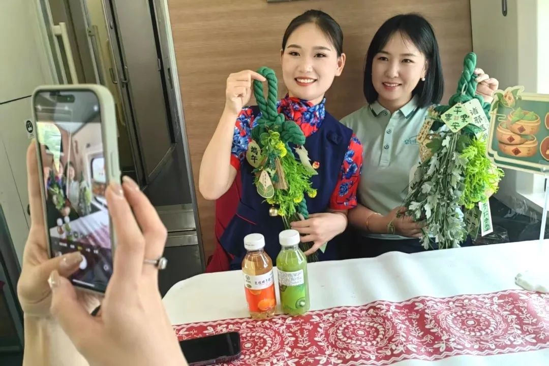登上列车,龙舟、粽子造型的拉花与“我的铁路风景”海报相映成趣,歌舞表演精彩纷呈,非遗手作端午荷包、五彩绳和粽子等让旅客充分感受到中华传统文化的魅力。