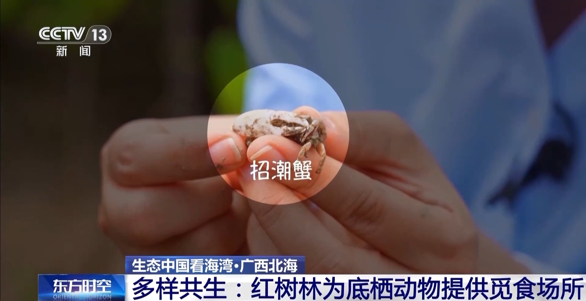 总台记者 王洁:我手上就有两只非常可爱的蟹类,非常小巧玲珑,很可爱活泼,叫拟相手蟹,喜欢爬树。灰白色的是雌蟹,雄蟹则是个更大而且全身通红,更加威风凛凛,它们叫“招潮蟹”。
